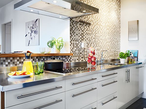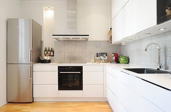 Nhà bếp nhỏ nhưng có rất nhiều đồ đạc bên trong tủ treo tường màu trắng mà còn nằm trong mô-đun quầy nhỏ gọn. Hai kệ mở kiểu dáng đẹp đảm bảo một không gian làm việc được tổ chức tốt và các thiết bị lớn đều có vị trí riêng. Phòng tắm nằm ở phía sau của căn hộ cùng với phòng ngủ hiện hướng ra sân trong.