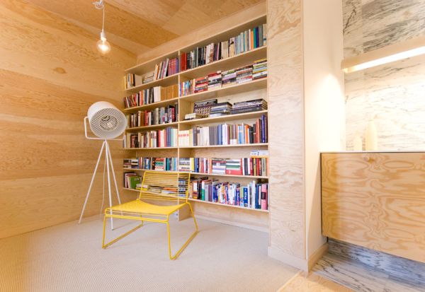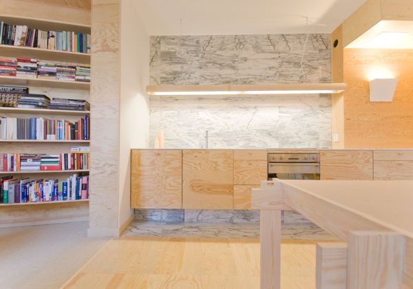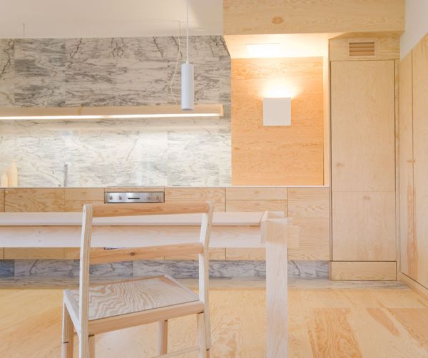 Như bạn có thể thấy, ván ép đã được sử dụng trên tường, sàn nhà và thậm chí trên trần nhà. Thiết kế liên tục này cũng bao gồm đồ nội thất đặt làm theo yêu cầu. Trong nhà bếp chúng ta có thể thấy sự kết hợp rất đẹp và hài hòa giữa ván ép và đá cẩm thạch. Hai vật liệu kết hợp tuyệt vời và kết quả là một phong cách trang trí đầy phong cách.