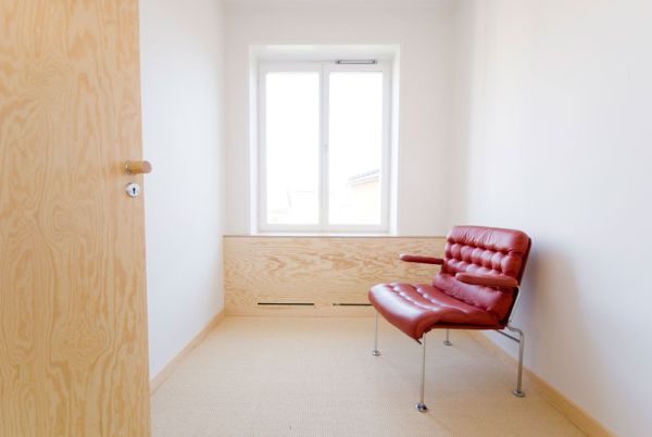 Phòng ngủ có lối trang trí tối giản. Giường được nâng lên trên nền gỗ dán và các bức tường được sơn màu trắng rõ nét. Các đồ đạc và phụ kiện còn lại vô cùng đơn giản. Bằng cách nâng cao giường, kiến trúc sư đã cố gắng nâng cao tầm nhìn ra cửa sổ và bằng cách này, bạn có thể chiêm ngưỡng những khung cảnh tuyệt đẹp. Cửa sổ cũng đón nhiều ánh sáng tự nhiên, tạo cảm giác thông thoáng và thư thái cho căn phòng.