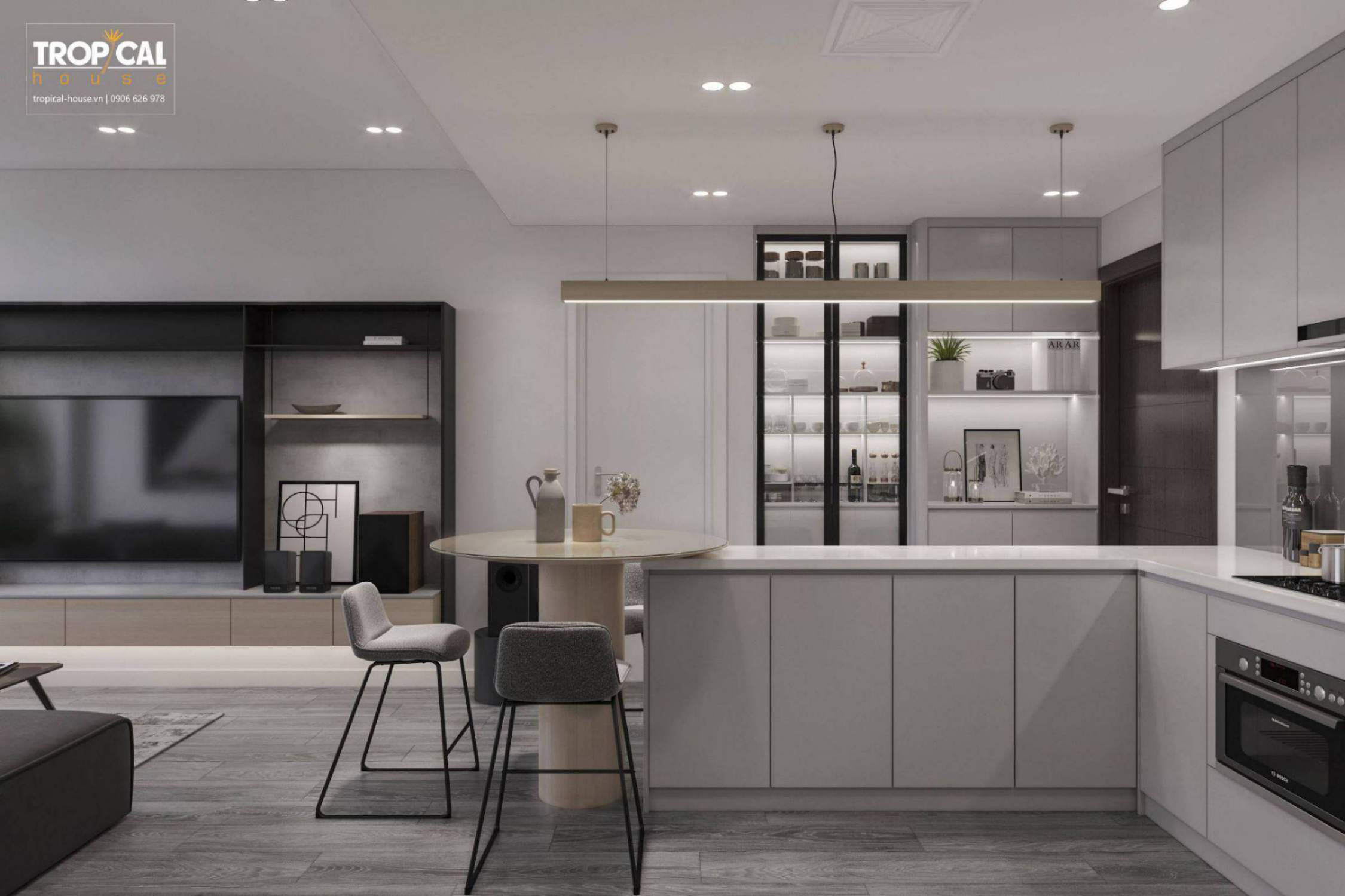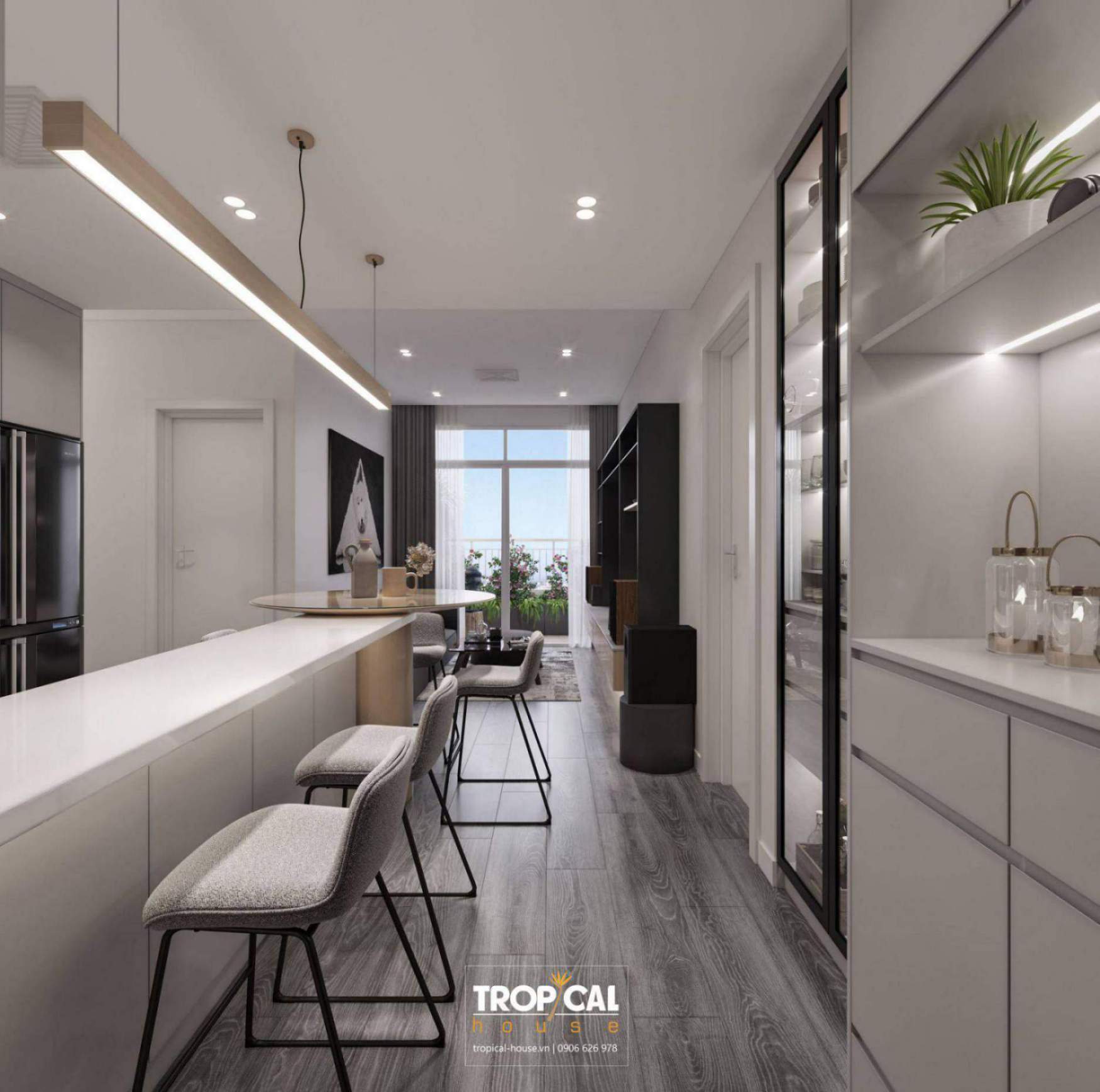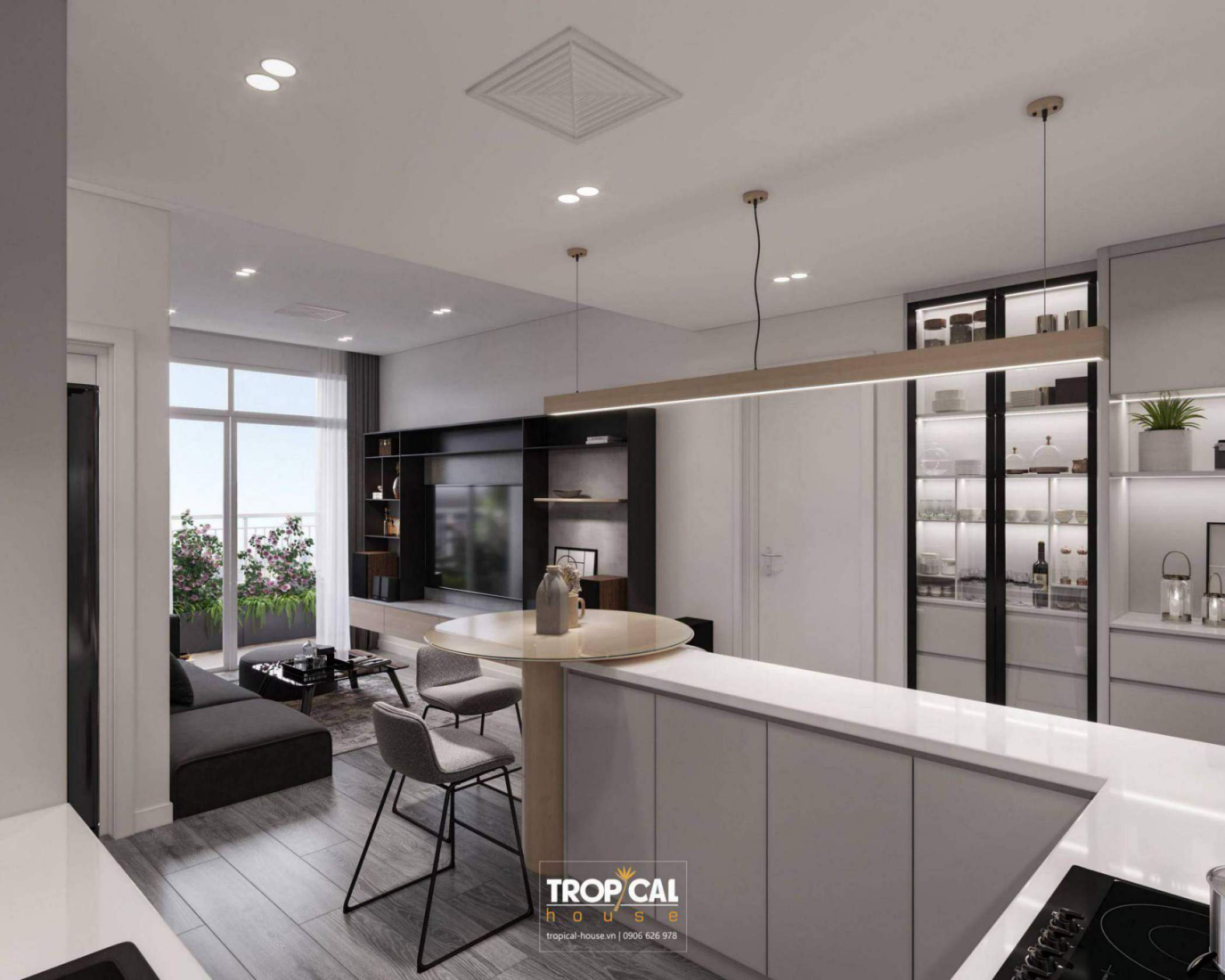 Căn chung cư được thiết kế theo phong cách minimalism kết hợp với hiện đại. Phong cách này hướng đến sự cân đối, hài hòa. Những chi tiết rườm rà được lượt bớt và đơn giản hóa không gian với nội thất tích hợp công năng làm cho không gian trở nên rộng rãi và gọn gàng hơn.