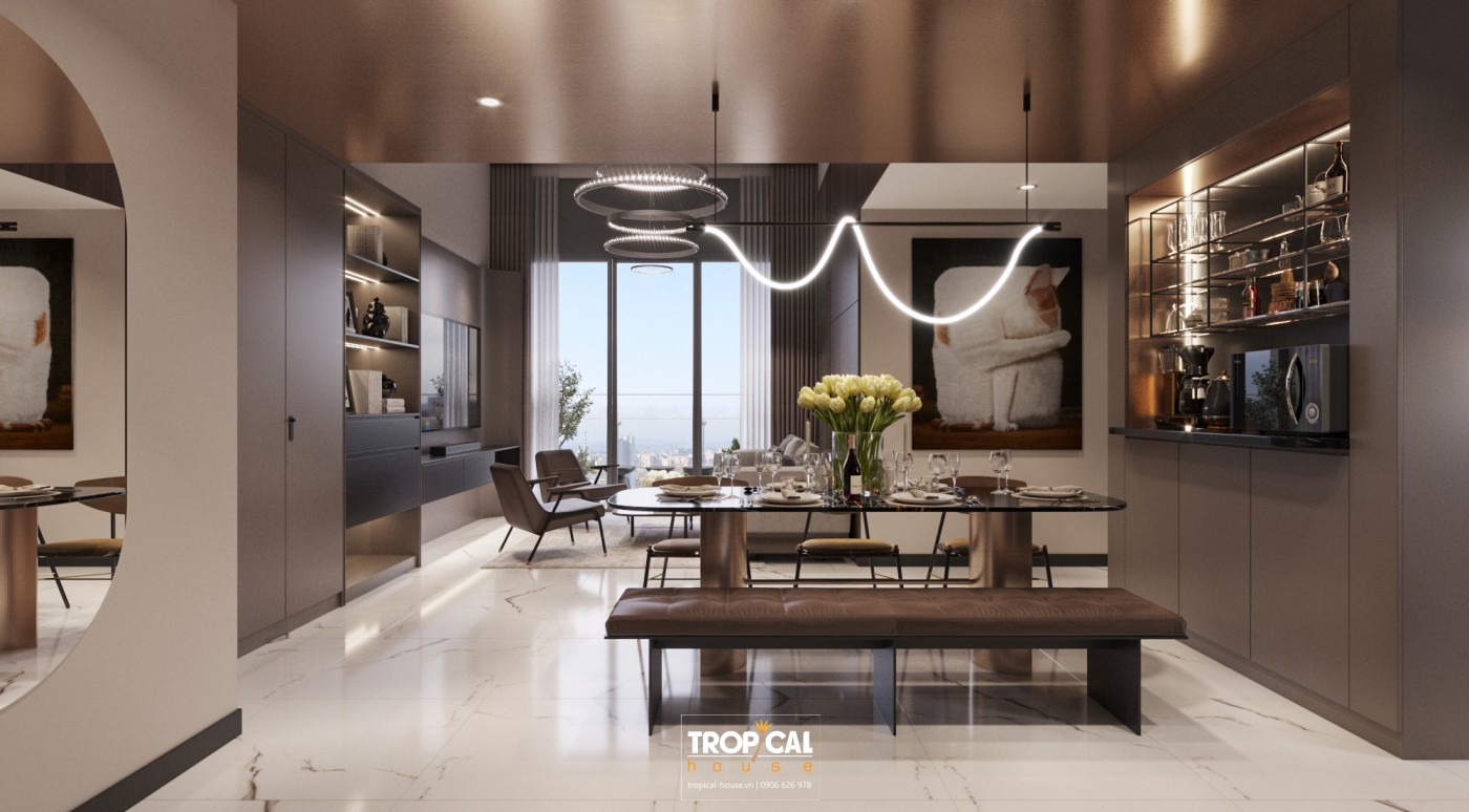Căn hộ chung cư được thiết kế theo phong cách hiện đại, tối giản, với những đường nét dứt khoát, mạnh mẽ, kết hợp cùng vật liệu cao cấp tạo nên sự chất lượng cho thiết kế.