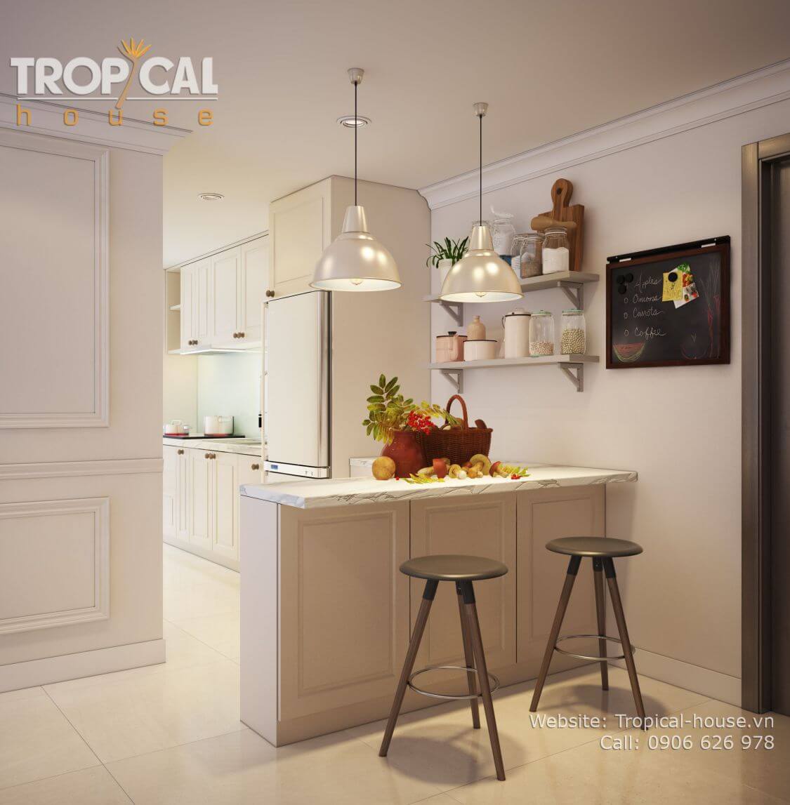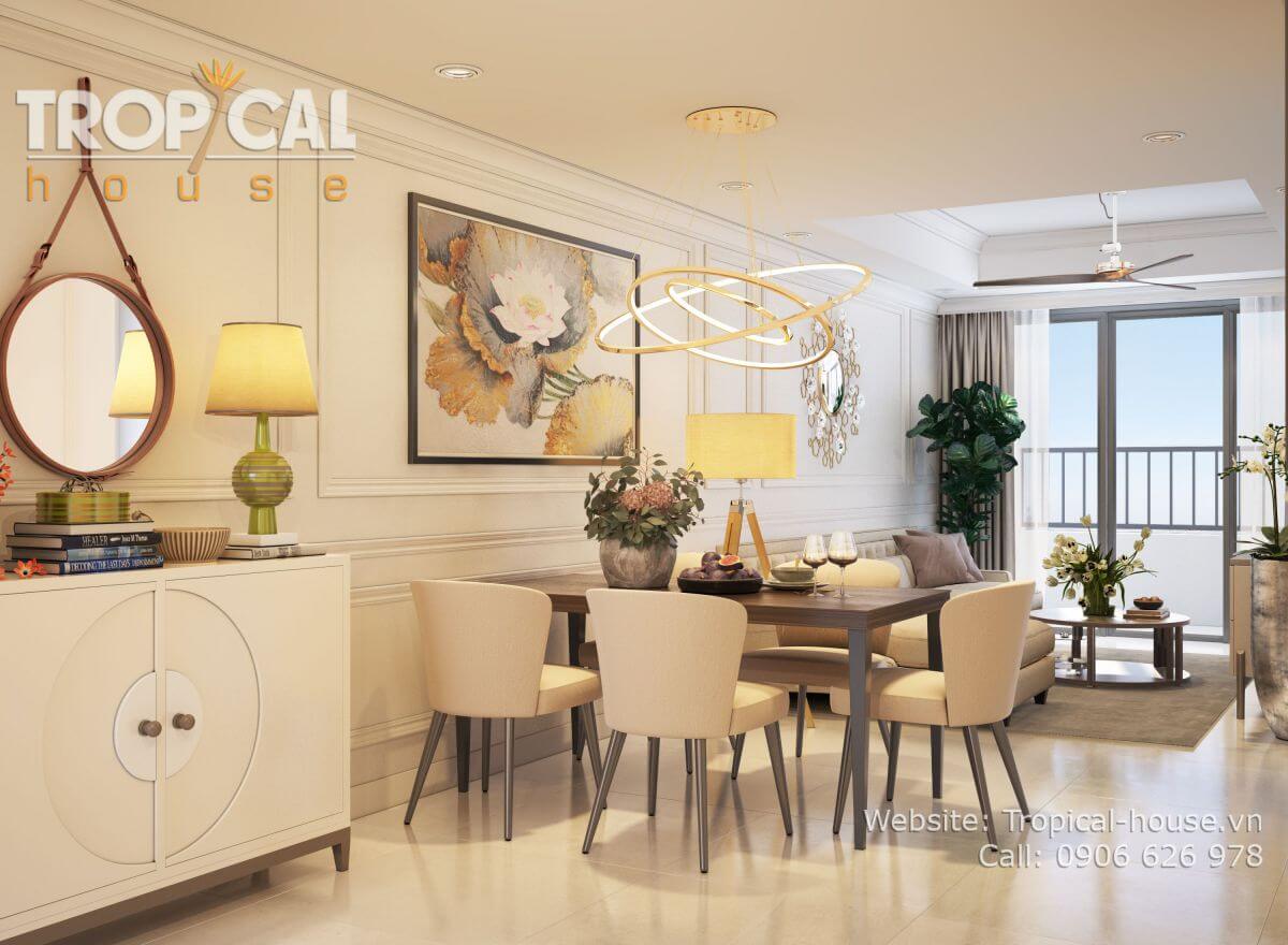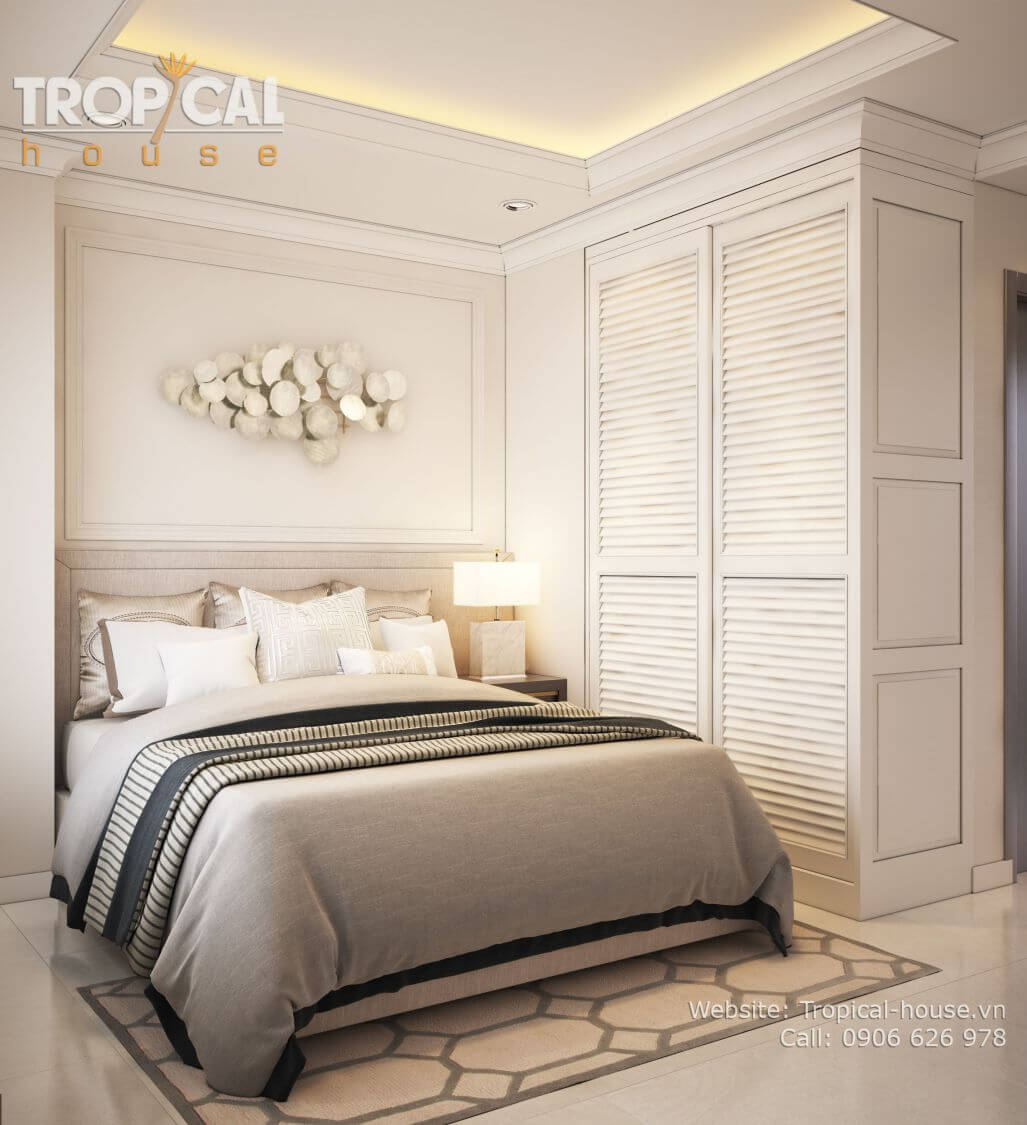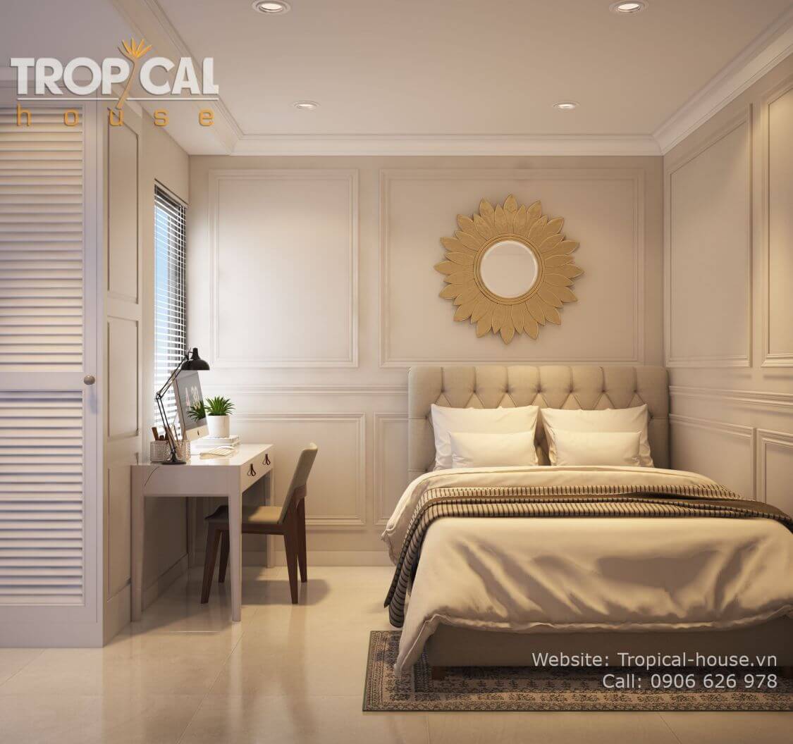 Phong cách thiết kế: bán cổ điển nhẹ nhàng, không gian ấm cúng. Sử dụng tone màu kem nhẹ nhàng, nhấn nhá bởi các đồ vật decor đặc sắc như: tranh treo, gương, vật trang trí treo tường...