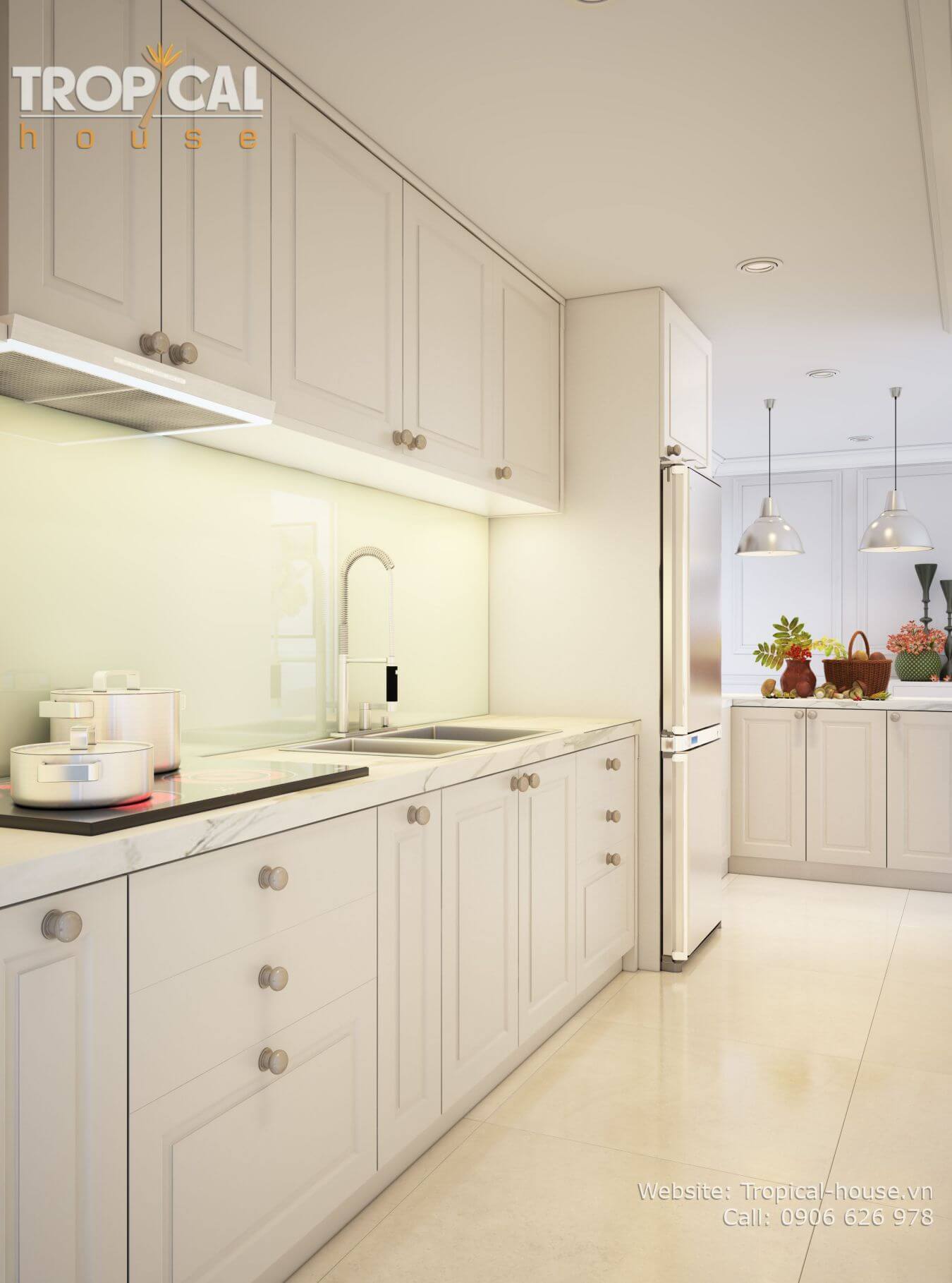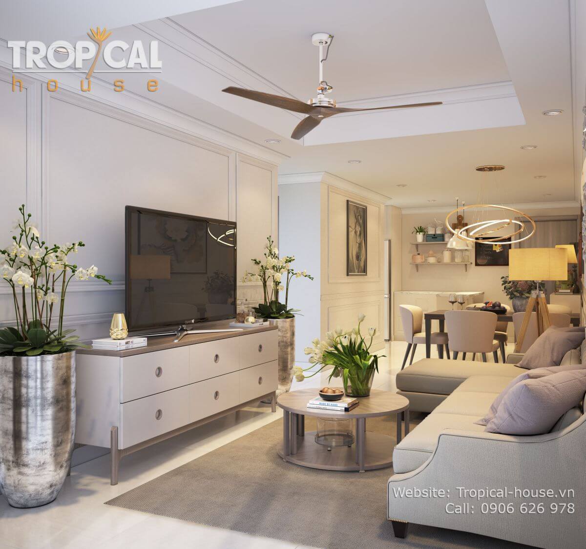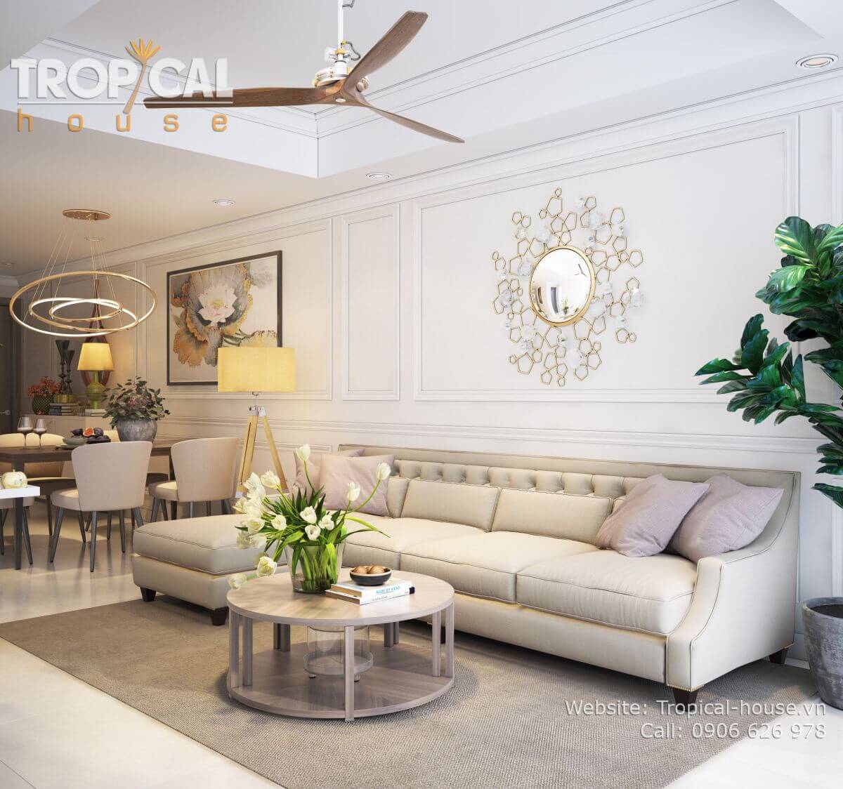 Phong cách thiết kế: bán cổ điển nhẹ nhàng, không gian ấm cúng. Sử dụng tone màu kem nhẹ nhàng, nhấn nhá bởi các đồ vật decor đặc sắc như: tranh treo, gương, vật trang trí treo tường...