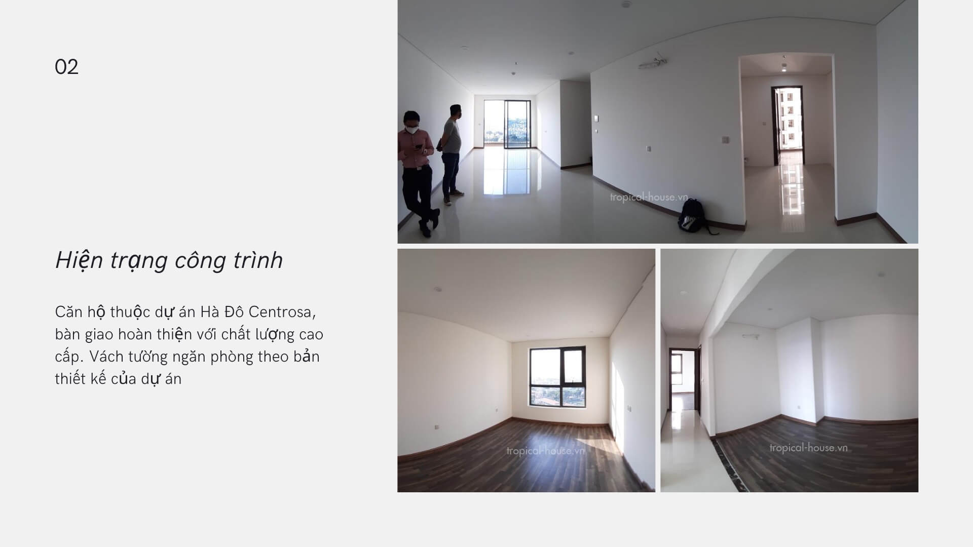 Hiện trạng công trình: Căn hộ thuộc dự án Hà Đô Centrosa, bàn giao hoàn thiện với chất lượng cao cấp. Vách tường ngăn phòng theo bản thiết kế của dự án.