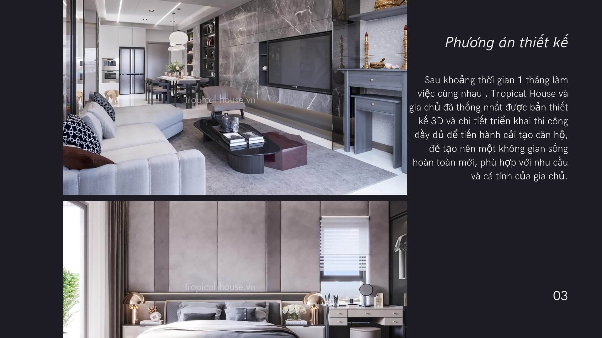 Sau khoảng thời gian 1 tháng làm việc cùng nhau , Tropical House và gia chủ đã thống nhất được bản thiết kế 3D và chi tiết triển khai thi công đầy đủ để tiến hành cải tạo căn hộ, đẻ tạo nên một không gian sống hoàn toàn mới, phù hợp với nhu cầu và cá tính của gia chủ.