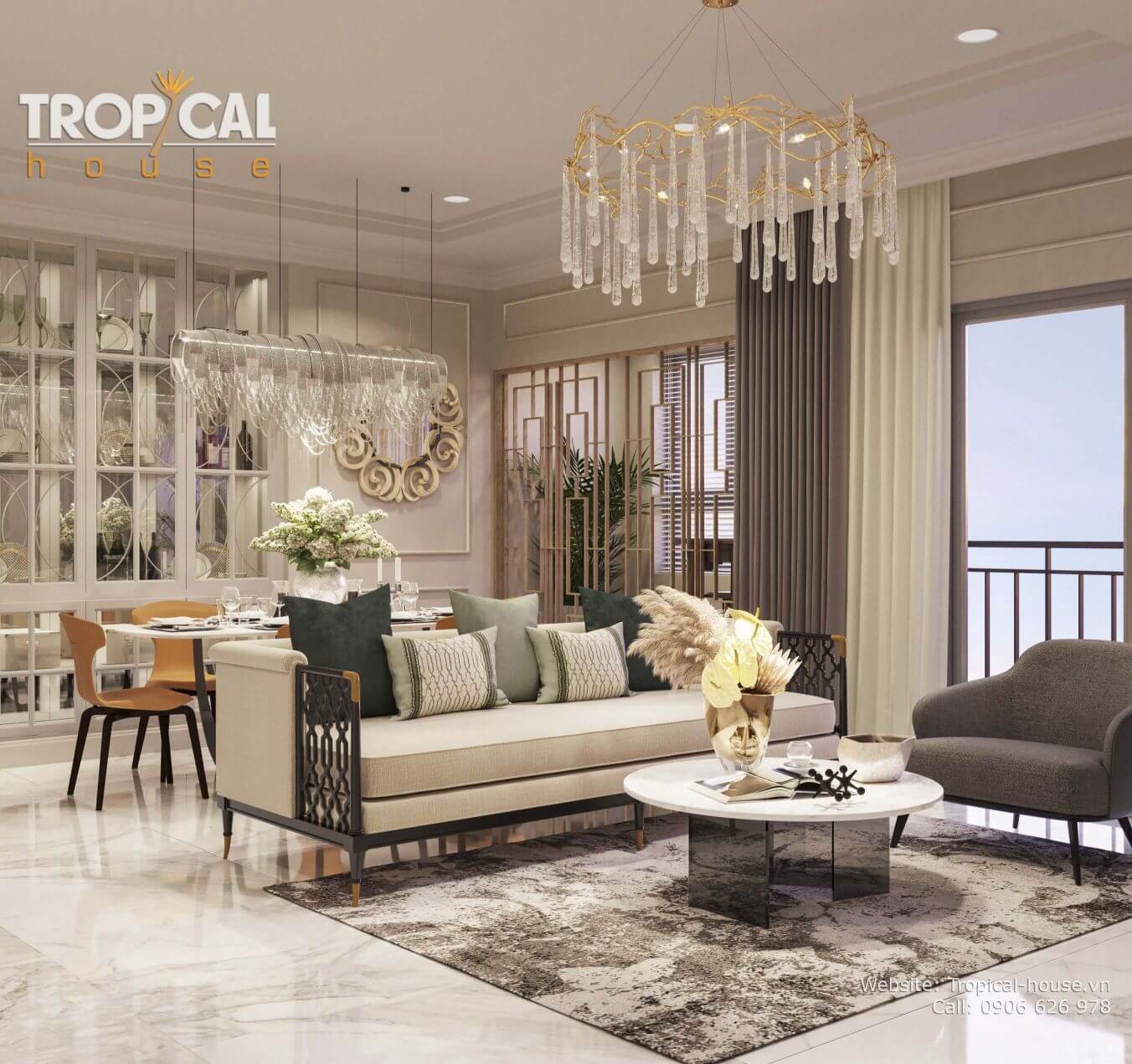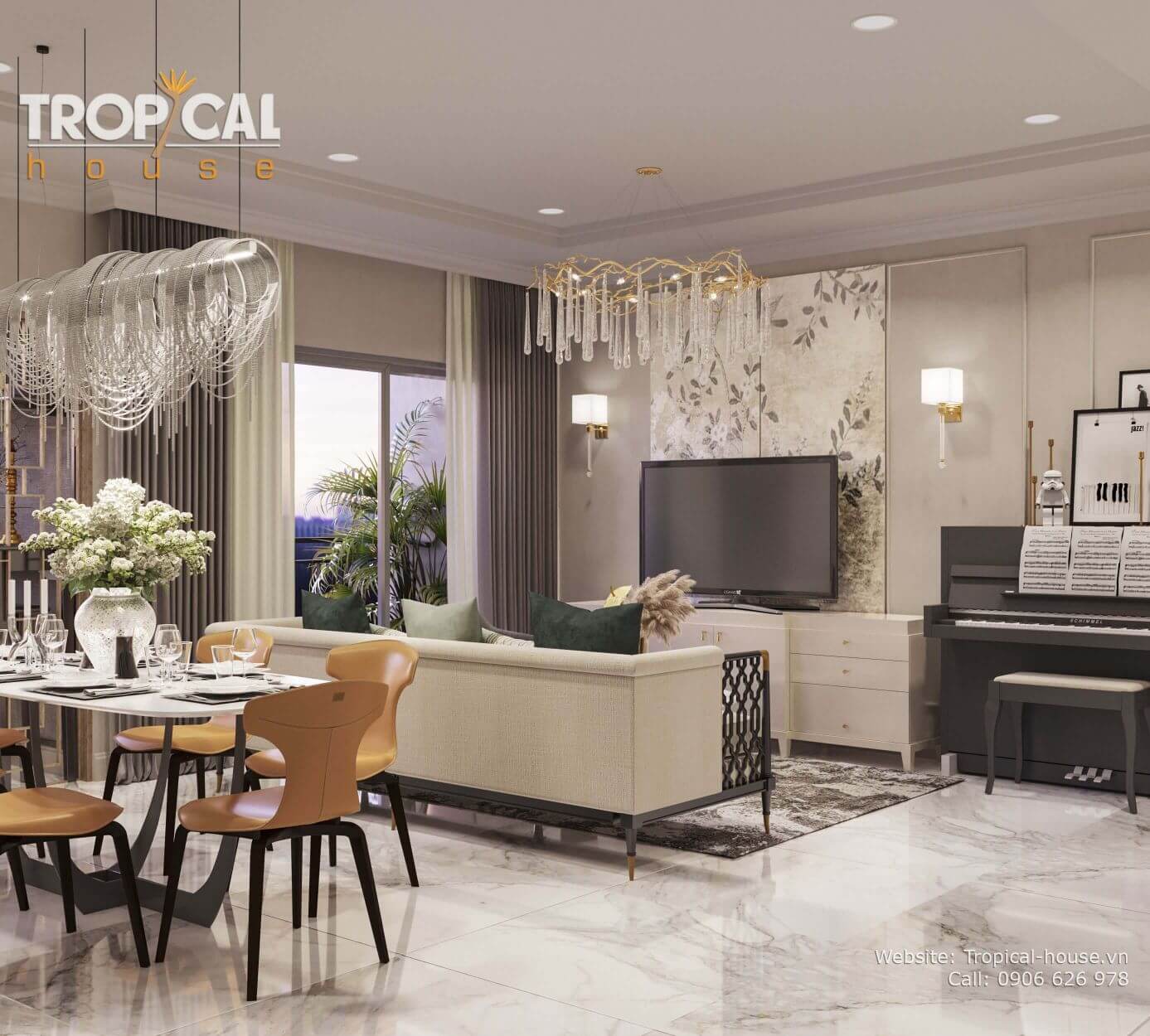 Chỉ với 1 không gian nhỏ và hẹp, Tropical House đã vận dụng tối ưu phương thức bày trí bối cảnh không gian để tạo nên cảm giác rộng rãi, thoáng đạt hơn rất nhiều so với diện tích thực của căn hộ. Gian phòng khách thì được trang trí lộng lẫy hơn với bộ đèn trần được cách điệu từ những hình dáng đơn giản nhưng lại tạo nên vẻ sang trọng cho căn hộ. Phòng ăn và các phòng khác thì được trang trí theo lối giản đơn hơn, loại bỏ những chi tiết không cần thiết để tận dụng không gian tối đa để tạo nên sự rộng rãi nhưng vẫn đủ tạo nét sang trọng và lịch lãm cho căn hộ.