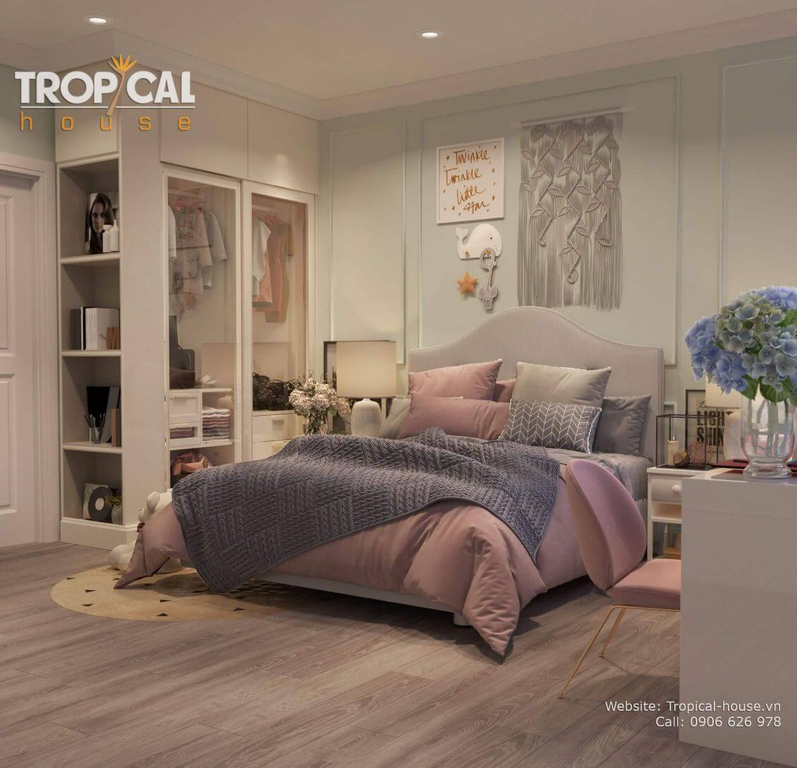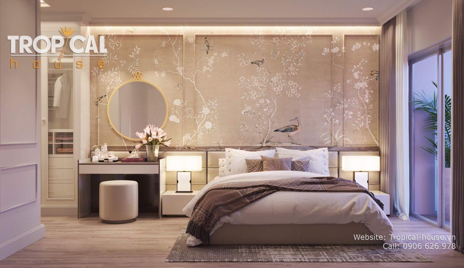 Không gian phòng ngủ được thiết kế với các hoạ tiết trang trí đầu giường như làm sáng lên cả căn phòng, với các màu sắc và hoạ tiết bắt mắt thu hút ánh nhìn ngay khi bước vào căn phòng. Với tông màu ấm tạo cảm giác ấm cúng, thư giãn và sang trọng đích thực tạo nên một không gian lý tưởng cho gia chủ được nghỉ ngơi, thư giãn và hồi phục năng lượng sau một ngày dài.