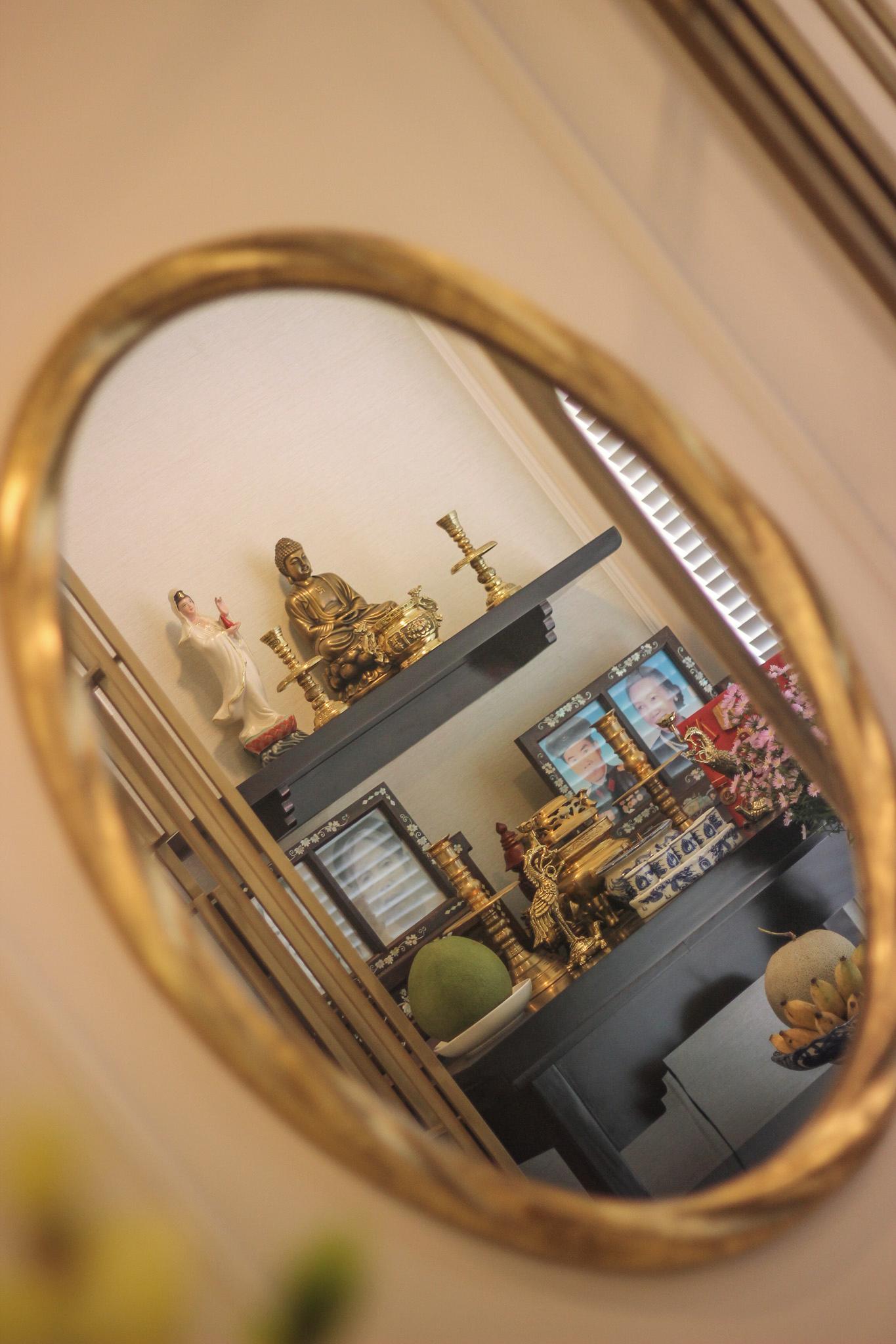 Phòng ngủ trước đây đã được bố trí thành phòng thờ để làm chốn tâm linh riêng cho gia chủ. Đặc biệt là khi 2 vợ chồng 1 người theo đạo Phật và một người theo đạo Thiên Chúa thì sẽ cần không ít công sức và ý tưởng trong việc bố trí không gian này.